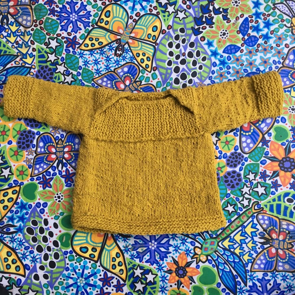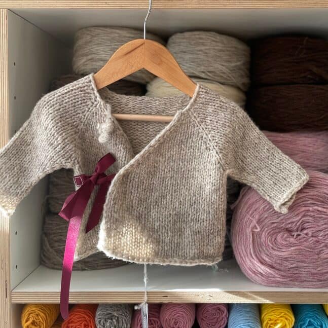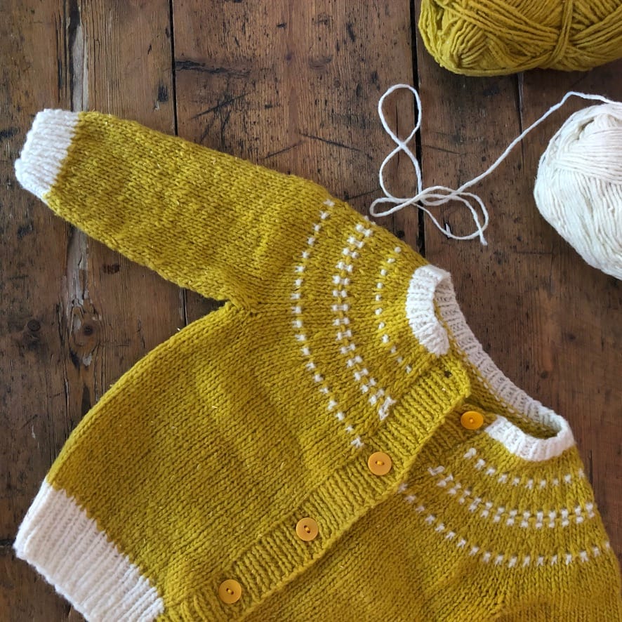 Arc-en-ciel named after the rainbow in the yoke, and designed by Solenn, the woman behind Dererum Natura Yarns. Pictured here in the ‘petite’ baby version in Ulysse, but also available as a child pattern using Gilliatt. Yes it needs 7 rainbow colours but only a tiny bit of each so a great one for scraps.