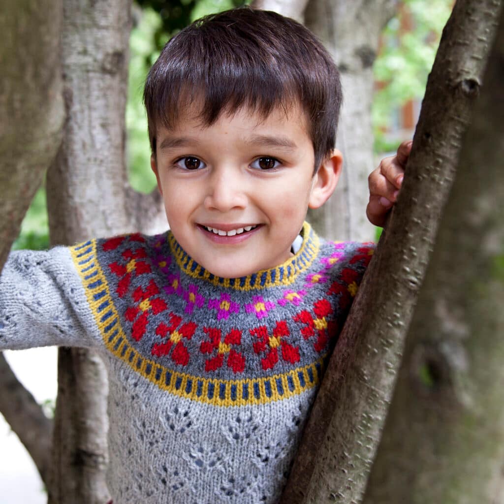 Mini Solja has been stealing our hearts in the shop ever since we opened 9 years ago. Anna Maltz’s miniaturised sweater named after the national flower of the Faroes which decorates the beautiful yoke. Make it with or without the fox paws lace in the body. João, Vovó, Ulysse or any other medim woolly DK would be great.