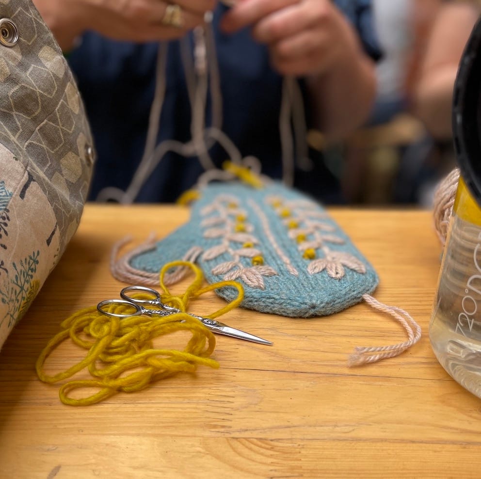 Judit is explaining the origins of her fascination with embroidery and her new book, Embroidery on Knits. As we talk, she’s adding petals to the stem of a plant on the back of a hand knitted mitten. Her work is deliberate and focused but it also has an un-hurried and fluent way about it. She knows exactly where she wants the needle to penetrate the fabric. Her hands continue to sew with this quiet confidence throughout our conversation.