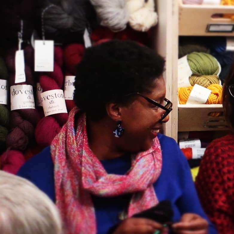 Carrot cake, lemon cake, chocolate cake.. Gail never arrives at the shop without a cake, her knitting and a smile that lights up the room. She comes from across town in Enfield to sweeten the shop’s monthly Late Night Knitty Lock-in, where she’s got the closest thing we have to a permanent seat reservation. There’s a pleasing pattern to the monthliness of our meetings as she’s often wearing the thing which was on her needles the time before. Gail’s knitting is not only prolific and beautiful, it’s also richly travelled, and full of faraway wool shop stories.