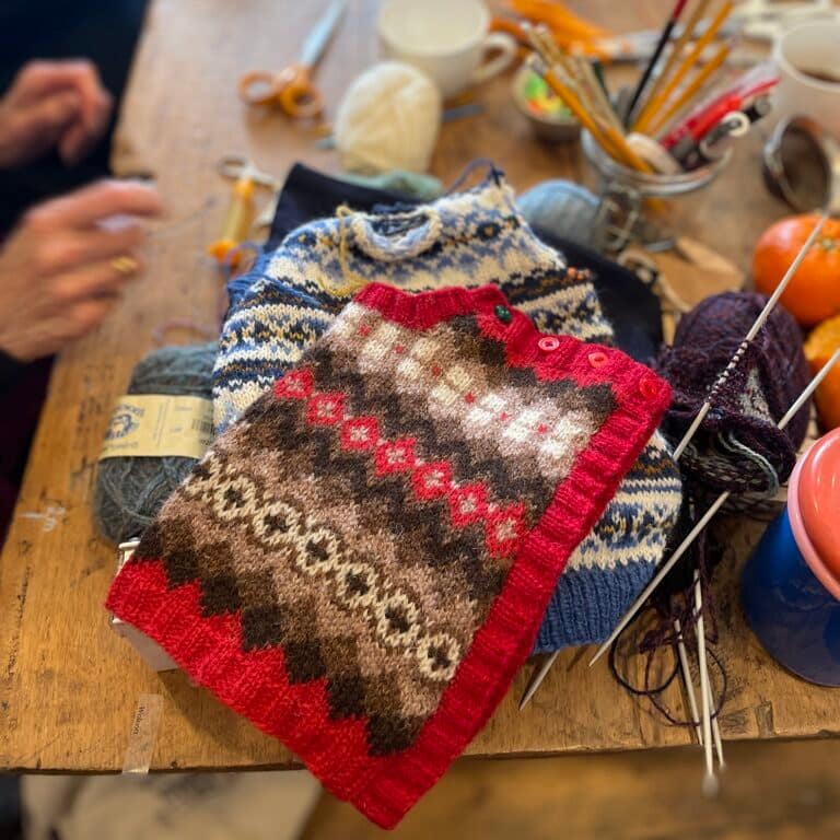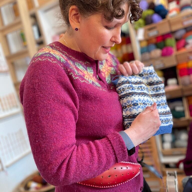 Although Janette’s visit had ostensibly been about bringing 2 new techniques classes to the shop – one on fairisle knitting, the other on steeking – it soon became clear that her technical skill was so interlaced with the fabric of her life, that from gauge to picking up a buttonband, each technique turned into a window on a lifetime of knitting..