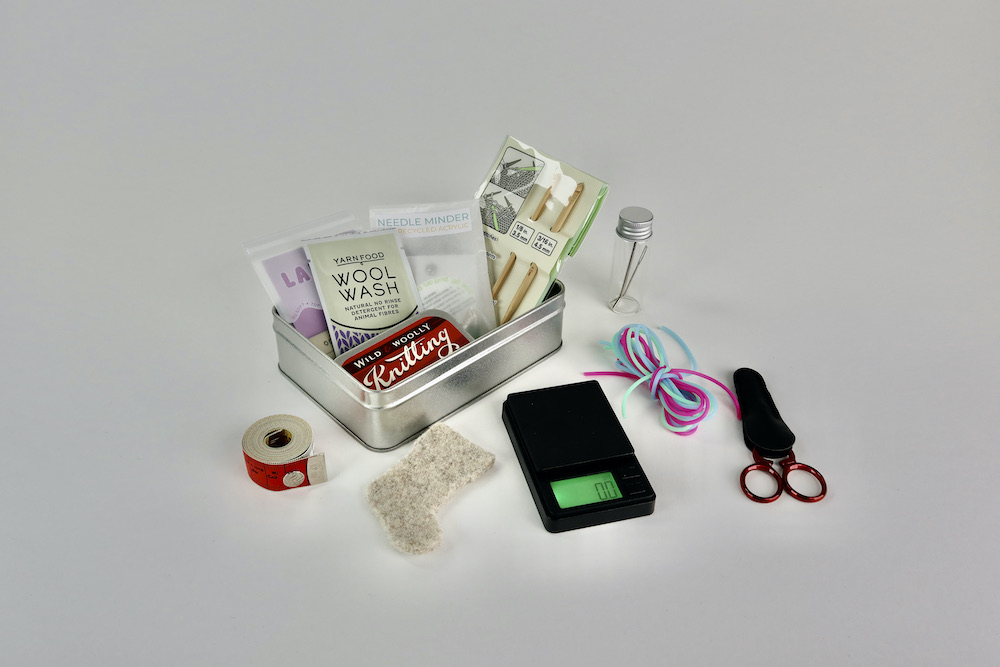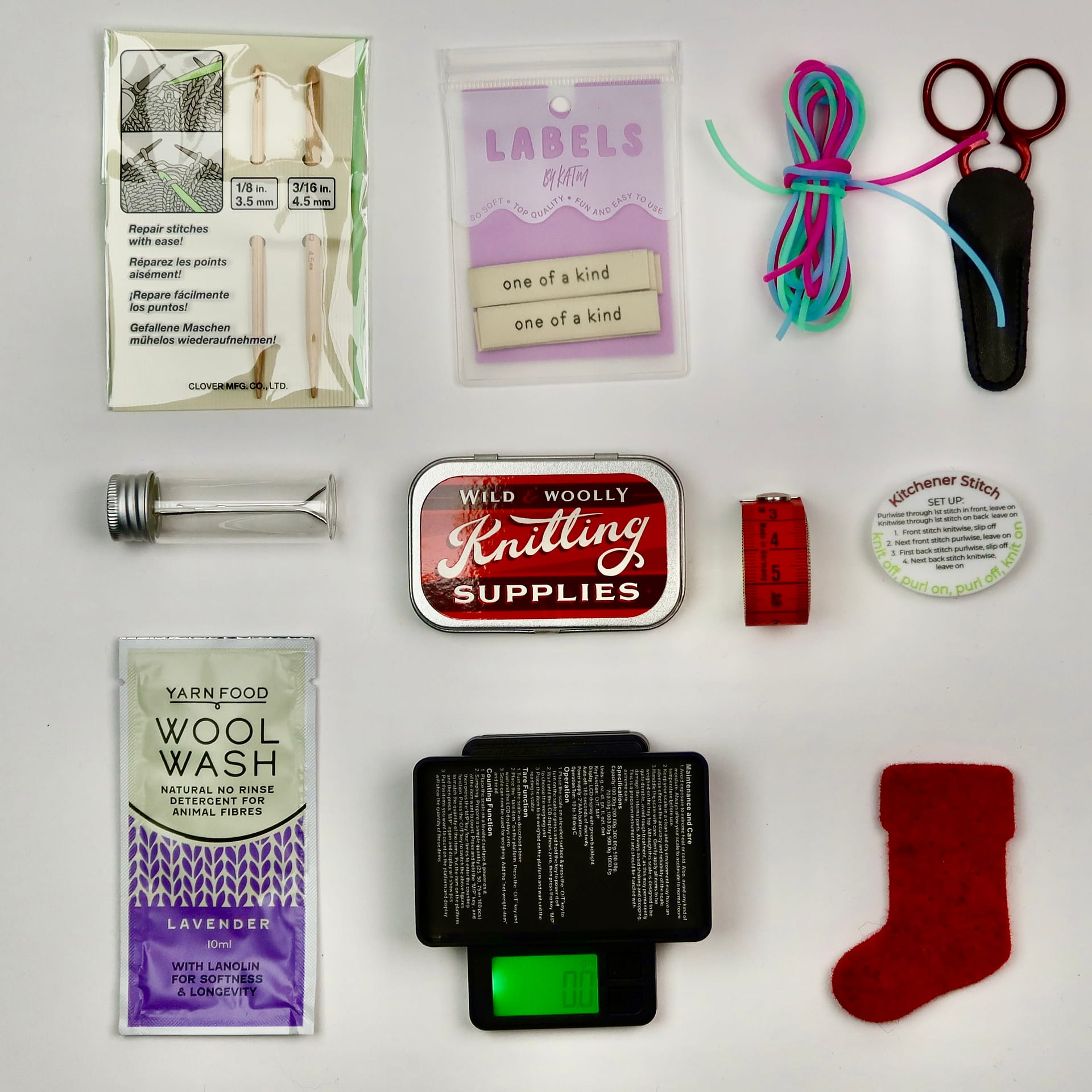 Row 3: an emergency sachet of Yarn Food wool wash, mini digital yarn weighing scales, and a festive felt shape.