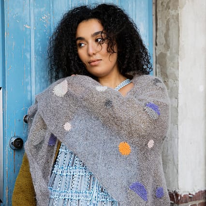 This ingenious little shawlette has your yarn leading the way, pattern-wise. Grab yourself a single skein of one of The Wool Kitchen’s Zip Yarns (the ones where the colour appears to all sit at one end of the skein – but is in fact a little ‘zip’ that comes around again and again), and off you go! Just follow the simple shape of the shawl and every time you get to a colour patch in the yarn, do the funky cluster stitch.