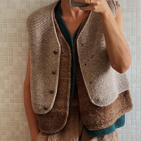 ..While we’re still on waistcoats, here’s another one that’s ticking all our summer knitting boxes – leaning in a slightly more mid-century elegant direction, this one has a texture which will suit knitters who’ve got more of a stitch-itch to scratch while on holiday. And with the first 5 sizes coming in at 1000m or less, it’s super-packable too. Go with a nice toothy DK like Vovó or make it even lighter with an airy sport like Cautiva or Ulysse.