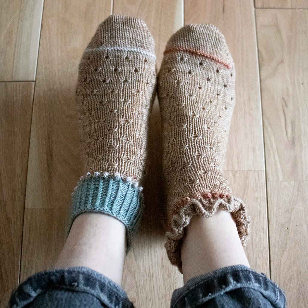 Delightfully diminutive bobbly bobbles, a ruffle that niftily skirts the grown up side of cute, and a just-for-the-knitter toe detail – KK has surpassed herself with these Peppercorns. Perfect for holidaying knitters who like a bit of heel technique to look forward to but don’t have an appetite for undivided knitting focus.