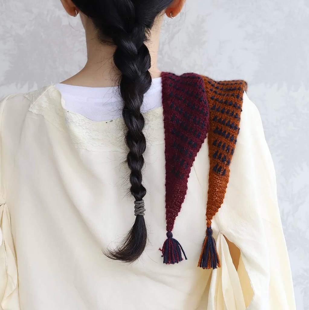 A little bit of colourwork and a ittle bit of texture go a very long way here with this super light and whimsical stripey triangle. I realise there are no shortage of narrow scarflette things out there right now but it was the tassles on this one – I just couldn’t leave them behind.