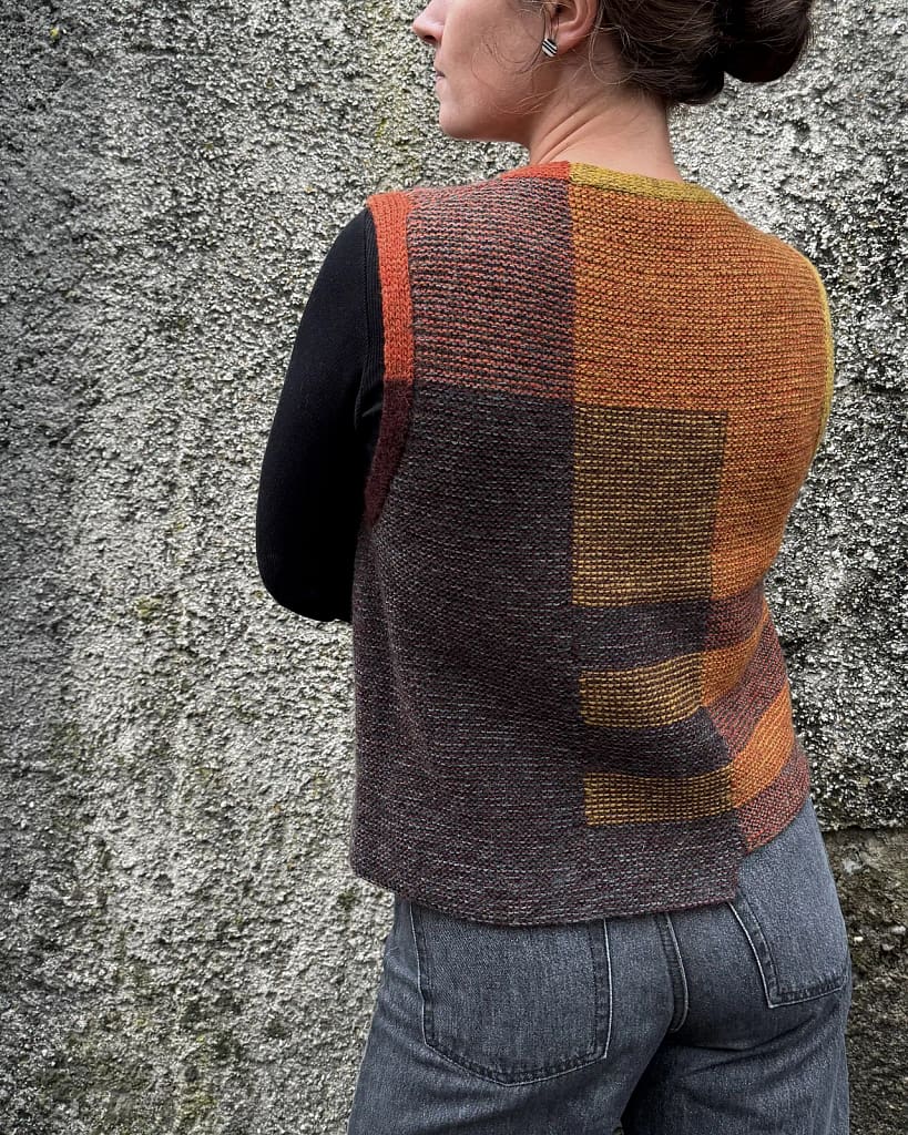 This more-than-meets-the-eye sweater vest just gets better each time you look. Separate fields of apparently solid colour dissove into 1 row garter stripes on closer inspection, and the quirk of that offset hem just makes perfect sense even though it absolutely shouldn’t.