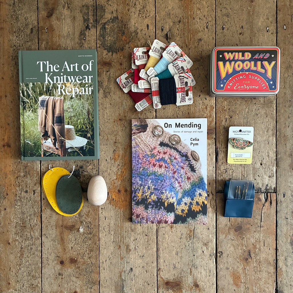 A Sajou wooden darning egg, a selection of Sajou darning threads, The Art of Knitwear Repair by Mintu Wikberg, On Mending by Celia Pym, magnetic needle case of tapestry needles, Wild and Woolly in a Box, Knitted Moth brooch, Suede elbow patches .