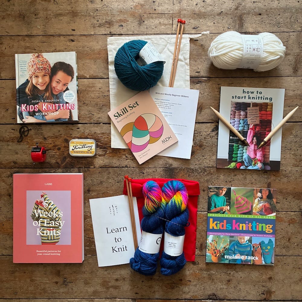 Kid’s Kitting Workshop by Susan B Anderson, Learn to Knit: The Mitts Kit, Learn to Knit: The Beanie Kit, Kids Knitting by Melanie Falick, Learn to Knit: The Scarf Kit, 52 Weeks of Easy Knits, Wild and Woolly Stitch Markers in a tin, Row counter.