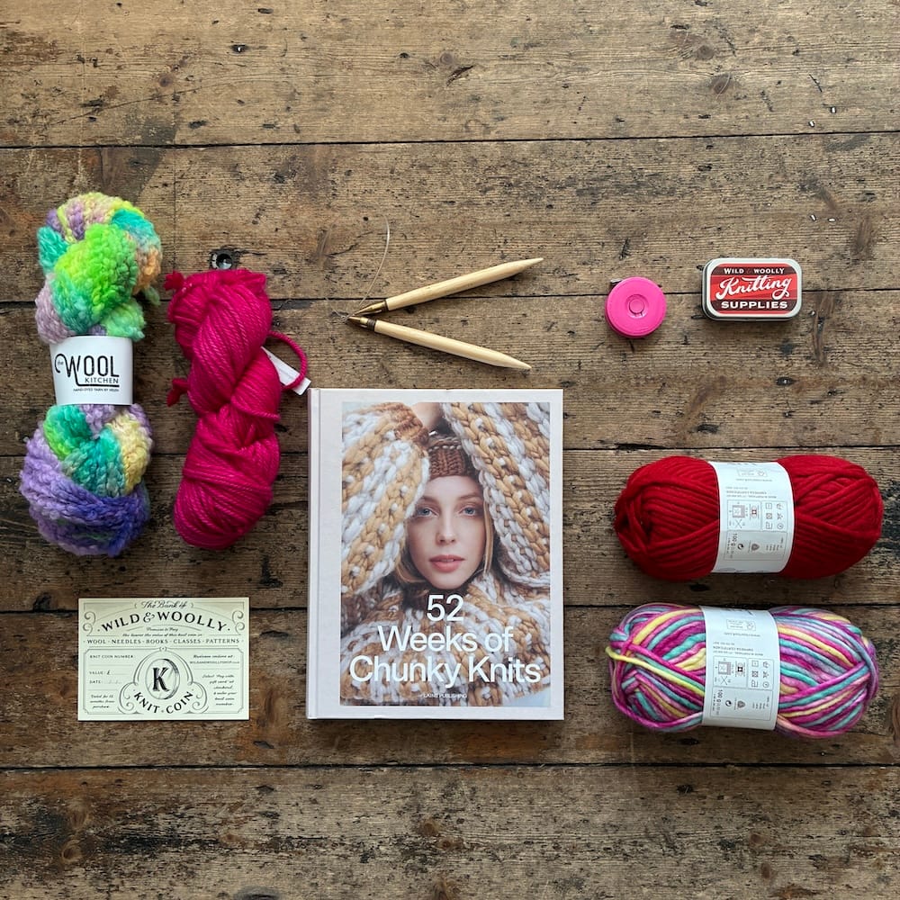 Chunky Bouclé by The Wool Kitchen, Malabrigo Chunky, Seeknit Bamboo Needles, Roll Fix Tape Measure, Wild and Woolly Stitch Markers, Rosarios 4 Bulky Light, 52 Weeks of Chunky Knits, Knit Coin Gift Voucher.