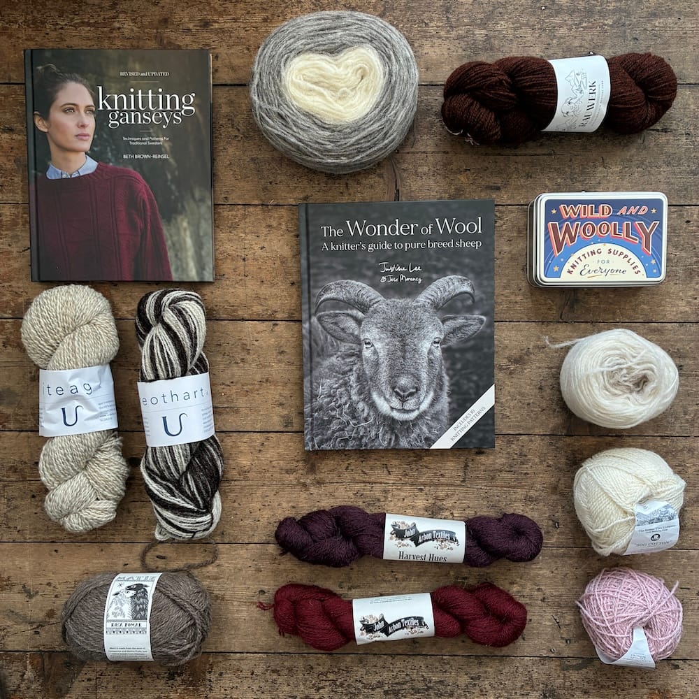 The Wonder of Wool, Birlinn Yarn Co Hebridean 4ply, Uist Wool DK, Wool Dreamers Breeds, Uist Wool Slubbing Cakes, Rauwerk Sport, Matiz by Rosa Pomar, John Arbon Harvest Hues, Knitting Ganseys by Beth Brown Reinsel, Guernseys Jerseys and Arans by Glady Thomson, Wild and Woolly in a box,