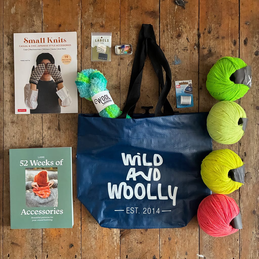 Small Knits by Yoko Hatta, Chunky Bouclé by The Wool Kitchen, Light reflective thread, KATM Labels, Jenerates Stitch Markers, OhWow Project Bag, Wool Dreamers Neon Mota, WIld and Woolly Bicycle bag, 52 Weeks of Accessories.