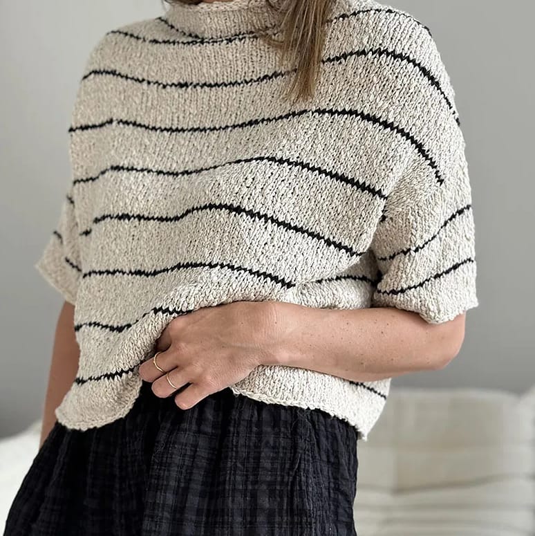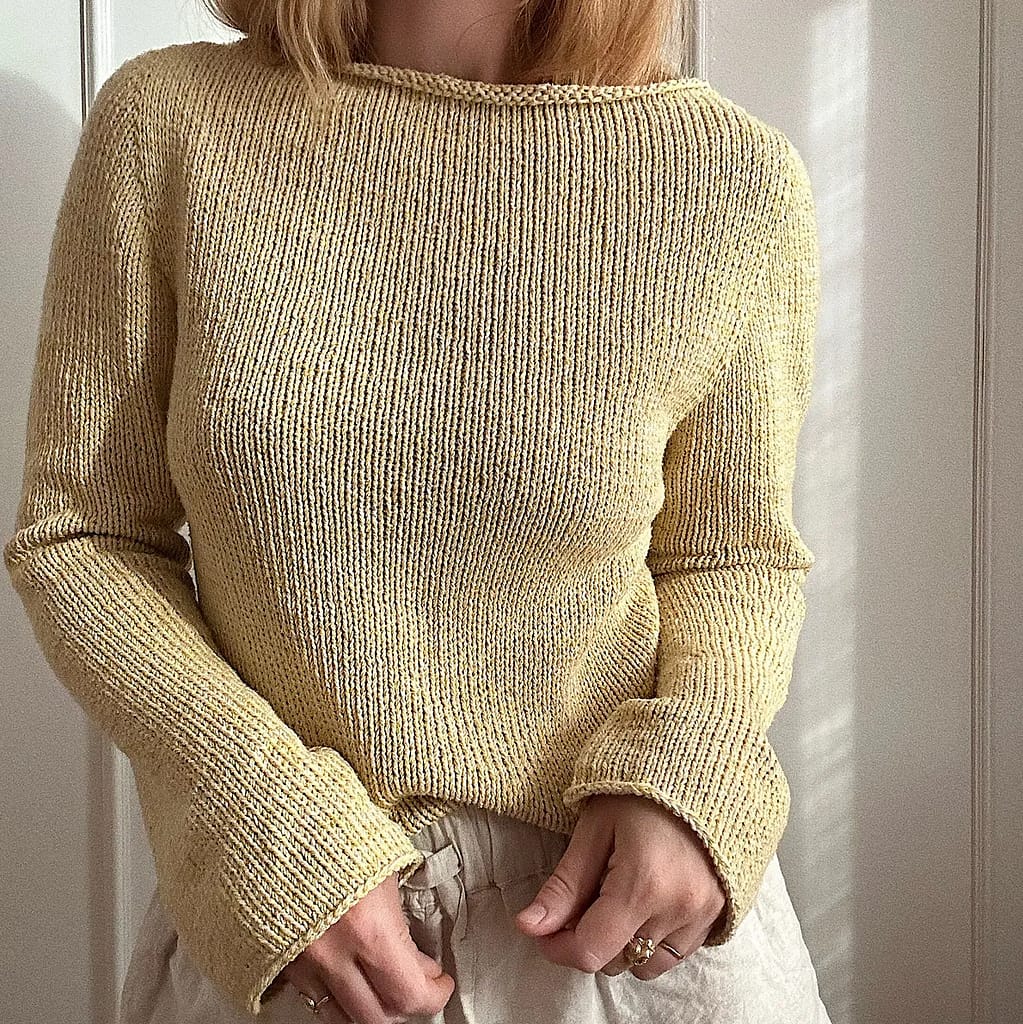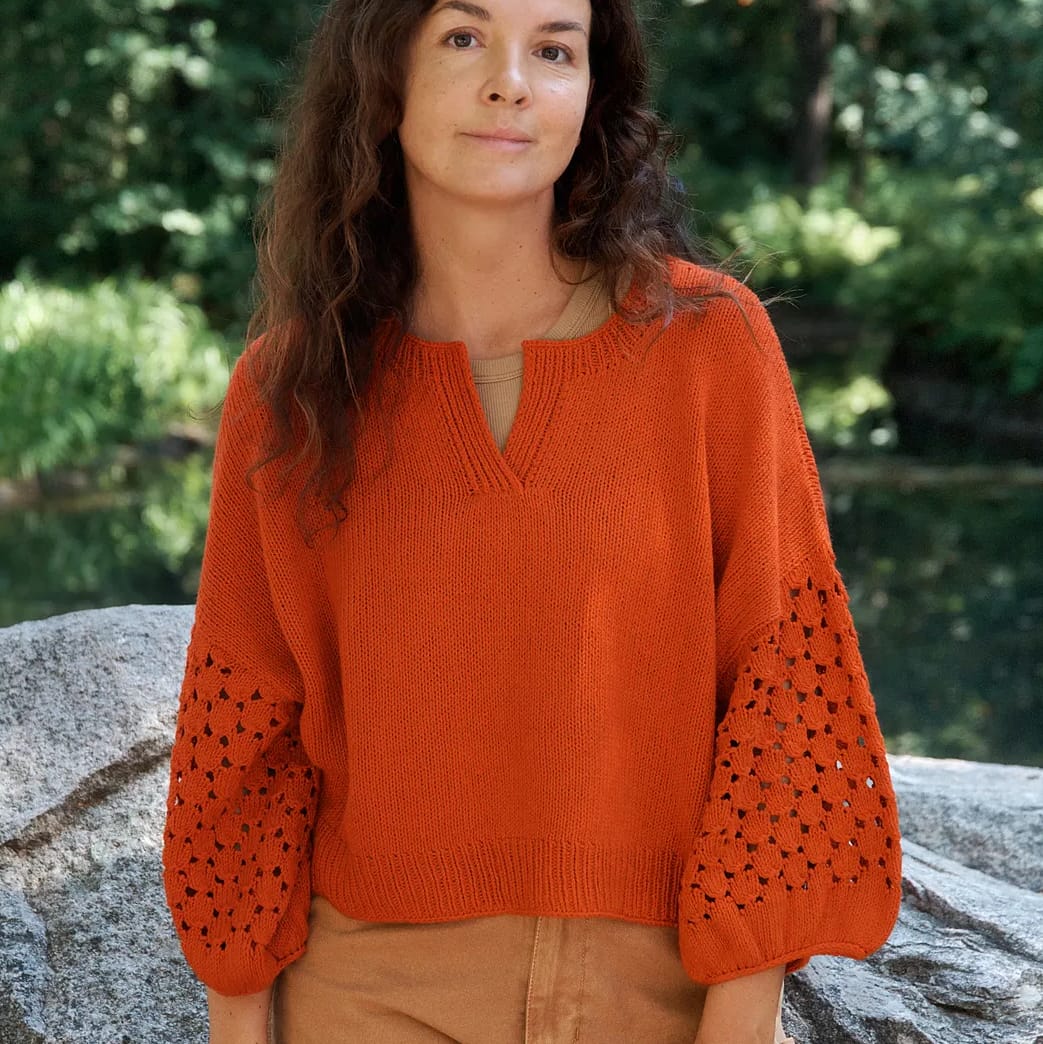 So the idea of a knitted blouse may take a moment to get the hang of, but hear me out – because I reckon it has more all-round use built into it than any other garment. Yes, it’s a sweater of sorts, but the blouse format comes by virtue of what you’re making it with. And as we’ve got bolder and better at sourcing interesting plant fibre yarns, there’s any number of options to knit a sweater pattern and make it a blouse. And if you’re not sure where to start, this slashed neck basic from MFT is ready and waiting for you.