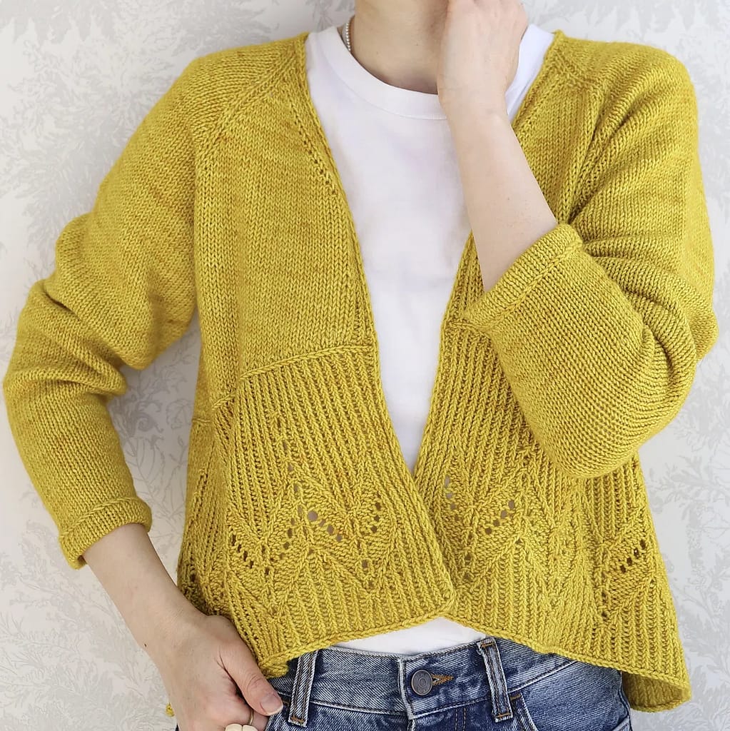 For knitters that want a side order of interesting with their stocking stitch main, this light weight cardigan has all the right construction notes around the shoulders and then goes complex and detailed with lace stitches on a twisted rib hem that hints at the movement of an unfolded fan. Subtitled-Scandi-noir thriller watching knitting, this is not, but I reckon the thrill of working that lace pattern makes up for having to switch off the telly and concentrate.