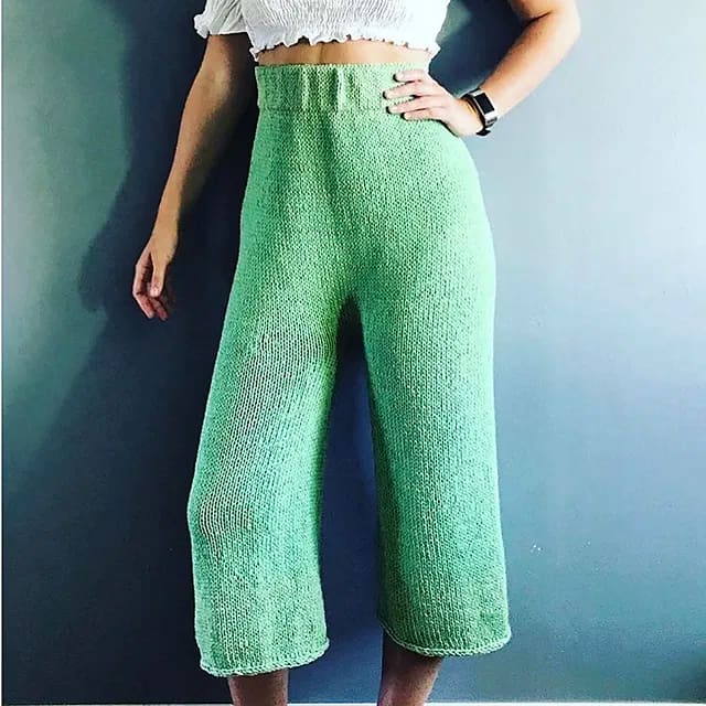 Don’t say, ‘don’t be daft, I’m not knitting trousers!’ Do say, ‘Oh my days, they look comfy and cool.’ So maybe it’s early days to say that knitted trousers are a thing – but things have to start somewhere – right? And these cullotte/trousers are just so inviting, with a pyjama-like pull-on comfyness about them, wouldn’t you just want to wear them all the time?