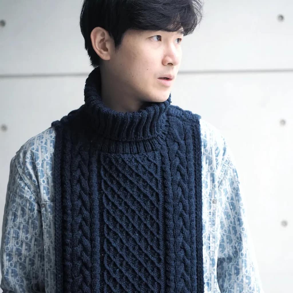 Welcome to the Dickie: A scarf cum knitted bib with a neck in the middle that masquerades as a sweater once you’ve got a jacket on. Keeps your front warm without bulking out your sleeves, and in the case of this beauty, will give you a chance to knit extraordinary cables without having to hike all the way up sweater mountain.