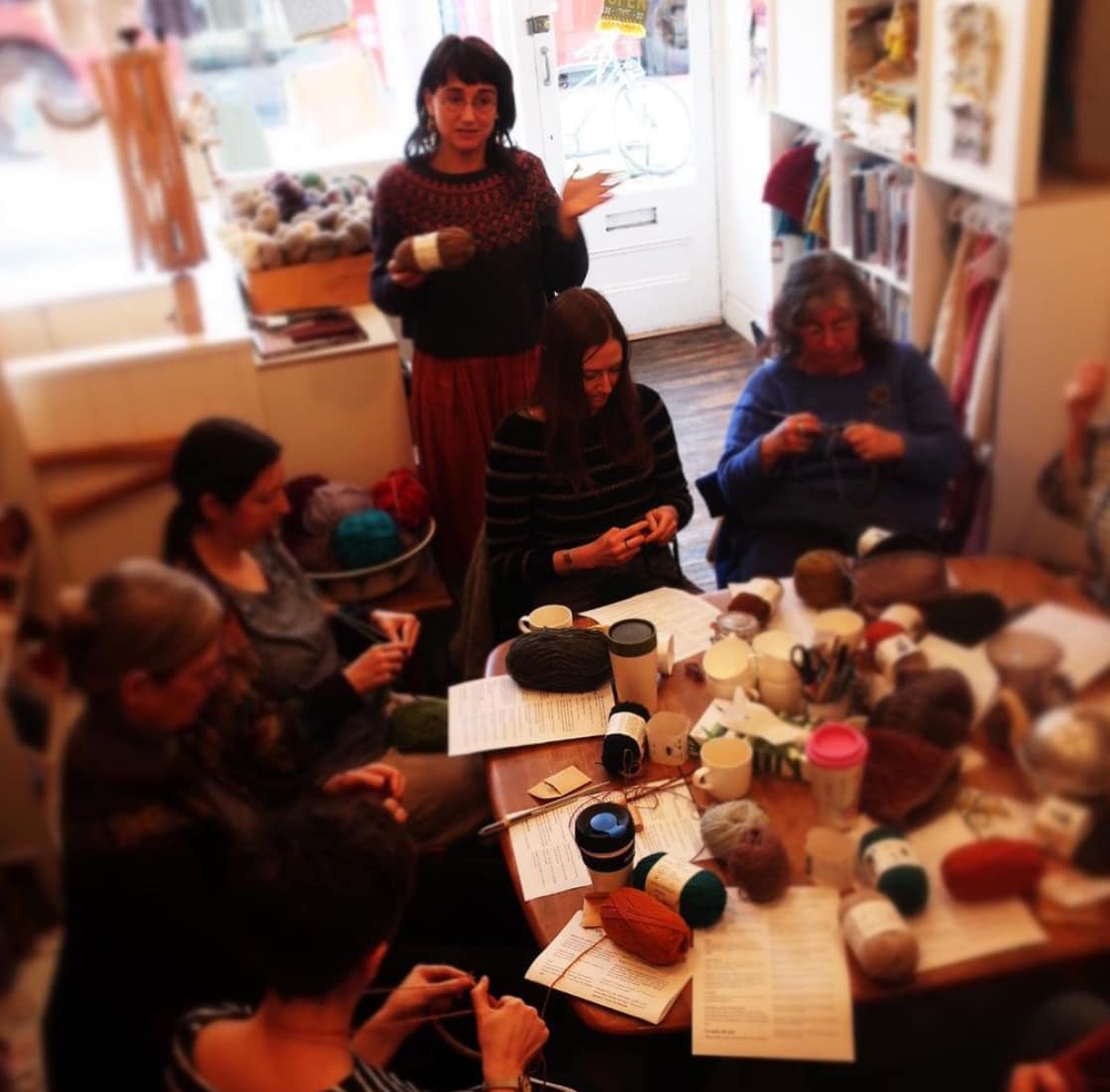 The students take their seats around the shop table, each with a ball of wool and a pair of knitting needles. I pour the tea, they share their names and some tell self deprecating stories of past knitting failures. I try and jolly things along with an introduction to the little hand warmer that everyone’s going to make. They exchange nervous glances.