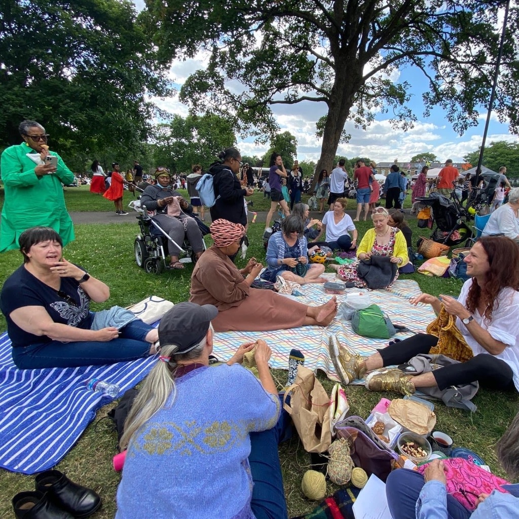 If you don’t want to sit on the ground, it’s a good idea to bring your own cushion or folding chair, and your knitting (obvs.). Also it will be mid afternoon so shareable snackerels and tea-time nicees  would work out well too.
