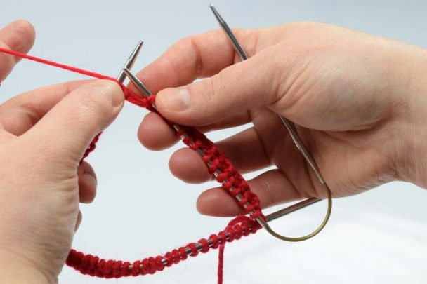 Addi's Crasy Trio is the latest solution to DPN-free small circumference knitting. Stitches are distributed over two of the flexible double-pointed needles, and you knit  off with a third needle - meaning that there are only two needle changes per row.