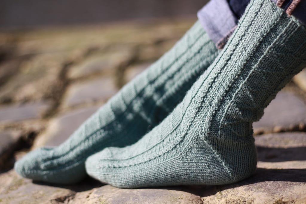These unisex socks will make an interesting project for a reasonably experienced knitter who is comfortable knitting in the round.