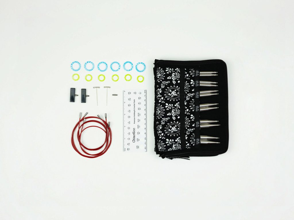 Tips, cables, stitch markers, needle gauge, end stoppers, cable connectors, and tightening keys all come in a compact fabric zipped-up case.