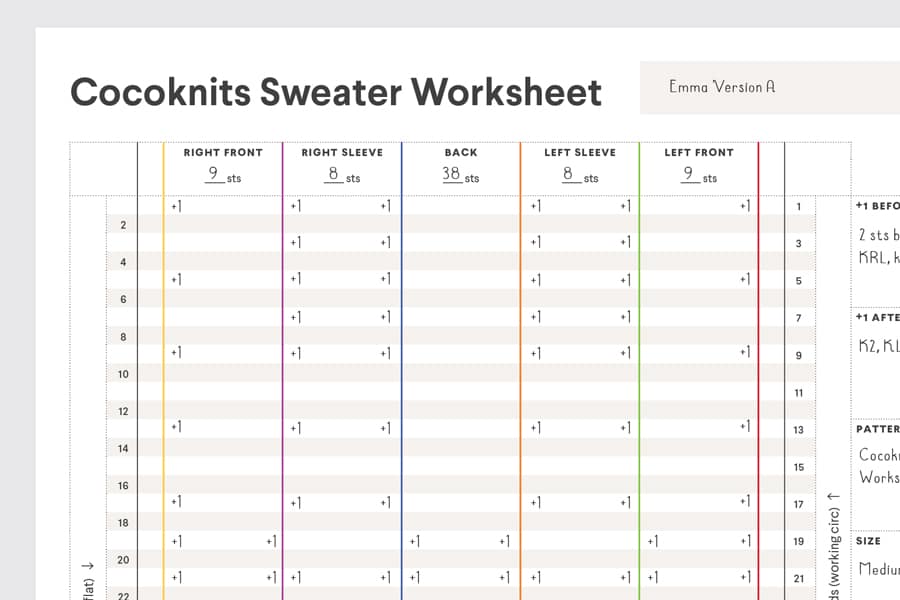The Cocoknits Sweater Worksheet is part of a system for knitting seamless, tailored sweaters from the top down, as detailed in Julie Wiesenberger's Cocoknits Sweater Workshop. Cocoknits Sweater Worksheets make knitting sweaters using the color-coded Cocoknits Method virtually carefree, with very little counting required.