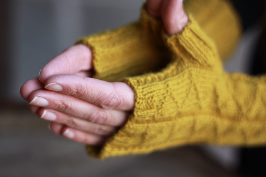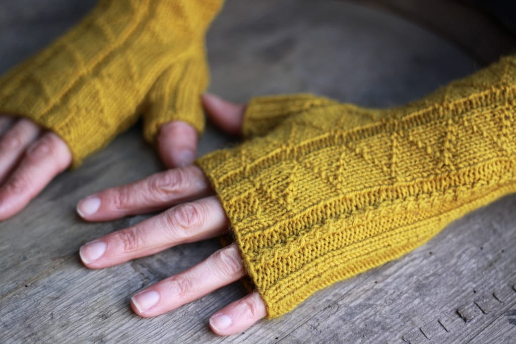 These unisex mitts will make an interesting project for a reasonably experienced knitter who is comfortable knitting in the round.