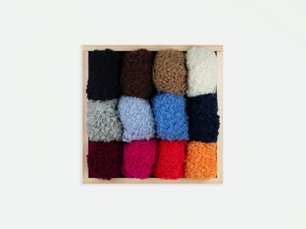 This alpaca boucle yarn creates a cosy and soft knitted fabric with so much teddy-ish texture, the knitted stitches are almost completely concealed. For this reason we strongly recommend against using it with patterns that call for any kind of intricate or complex textured stitch work, as it is likely to be lost in the jumble of teddy curls and slubs.