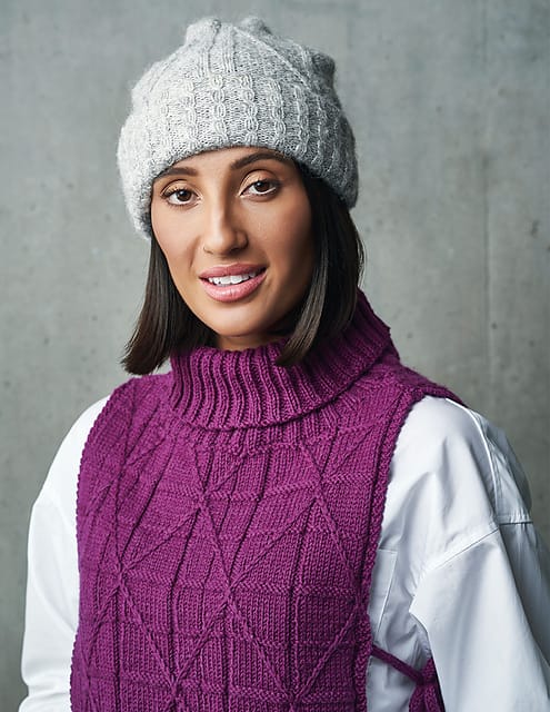This inspiring accessories collection by Georgia Farrell features 10 geometric textured knits inspired by the architecture of London. A bold and dynamic colour palette, a mix of timeless, wearable pieces with loads of contrasting textures, angular shapes, and cable and slip stitch details are all evocative of Georgia's signature style.