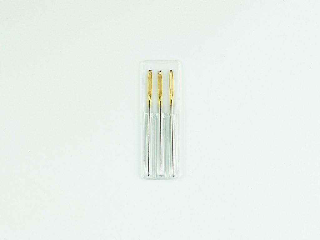 A pack of 3 blunt-ended needles used for sewing in ends or seaming knitted pieces.