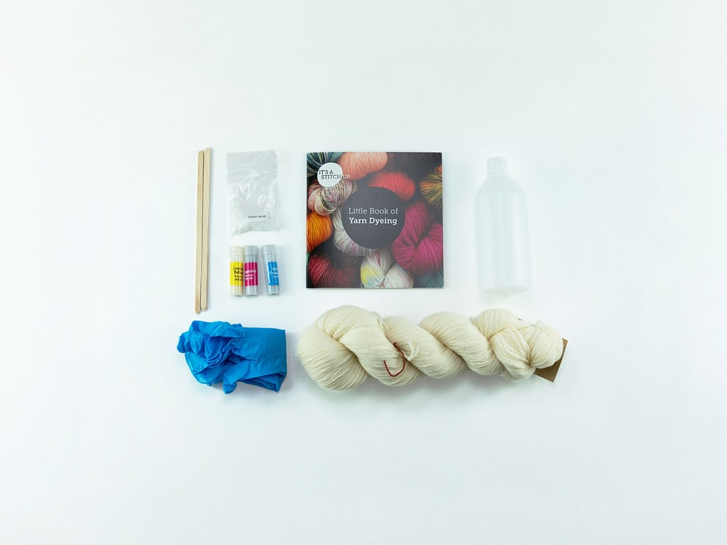 Each beginner-friendly kit is a fantastic introduction to dyeing your own yarn. The materials and instructions enable a wide variety of colour effects to be achieved. No dyeing experience is needed. The kit's undyed, superwash yarns are ethically sourced and have been chosen because they dye brilliantly. And Suzie Stitch-Up's Little Book of Yarn Dyeing, works as an approachable guide for beginners and handy reference for those with a little more experience.